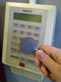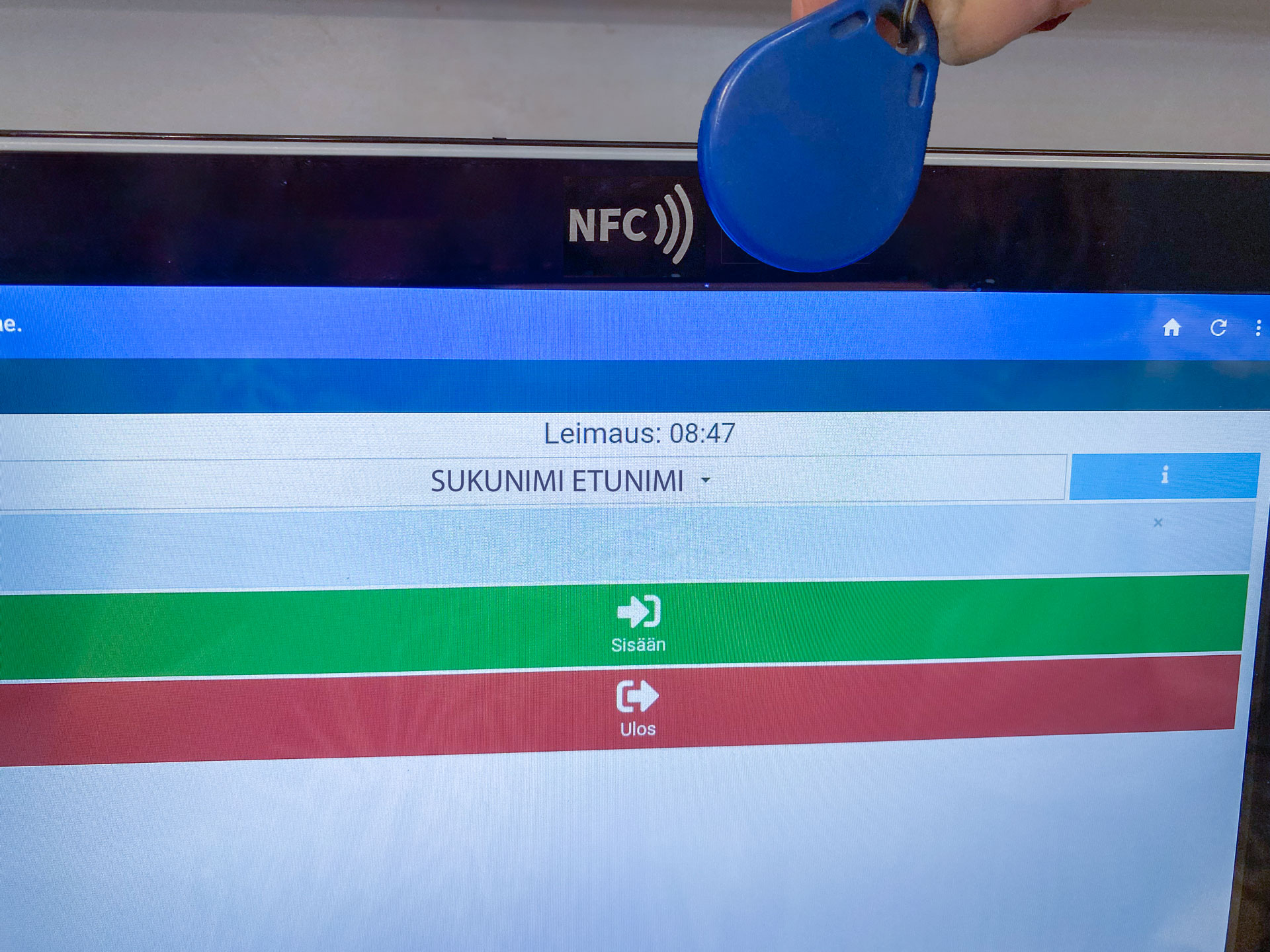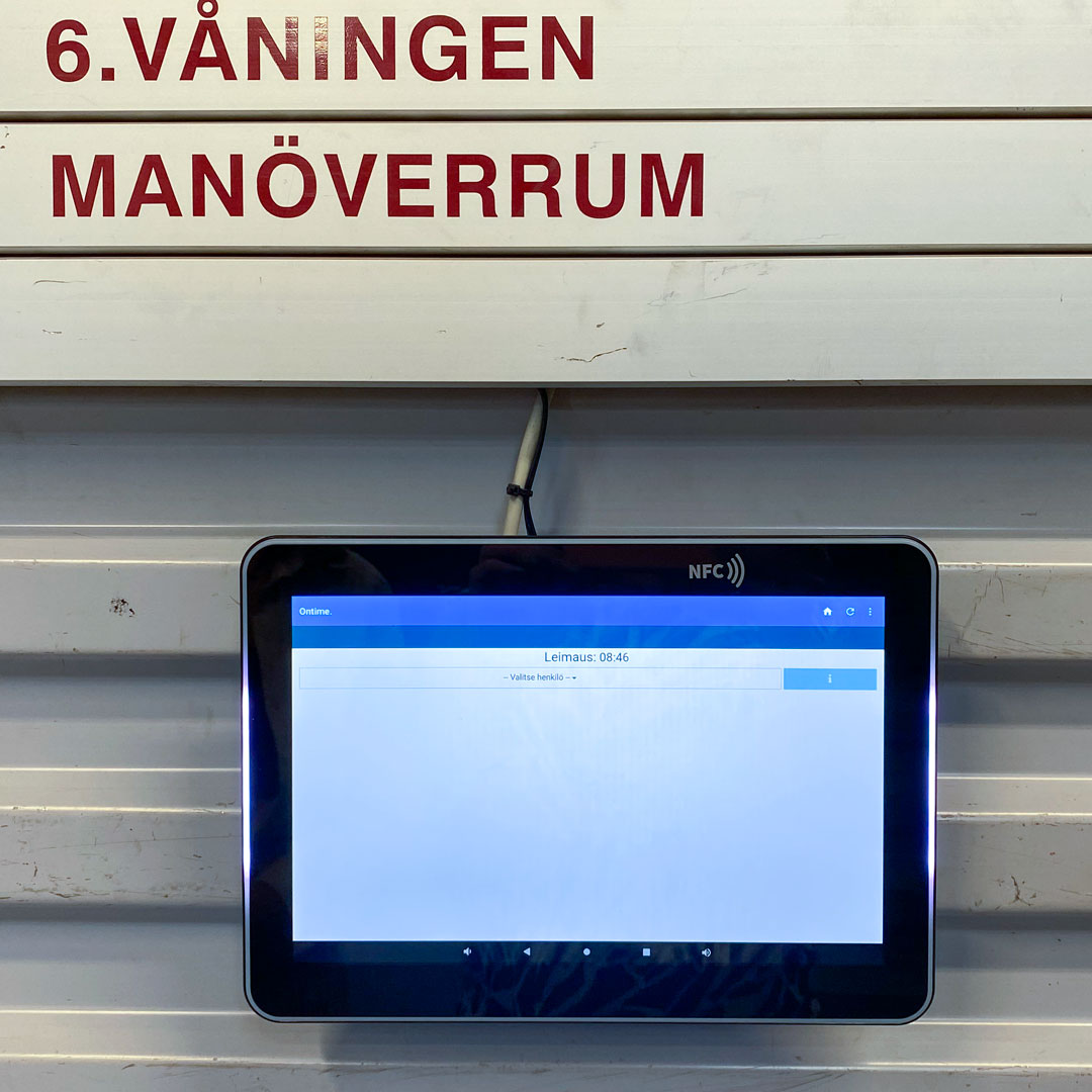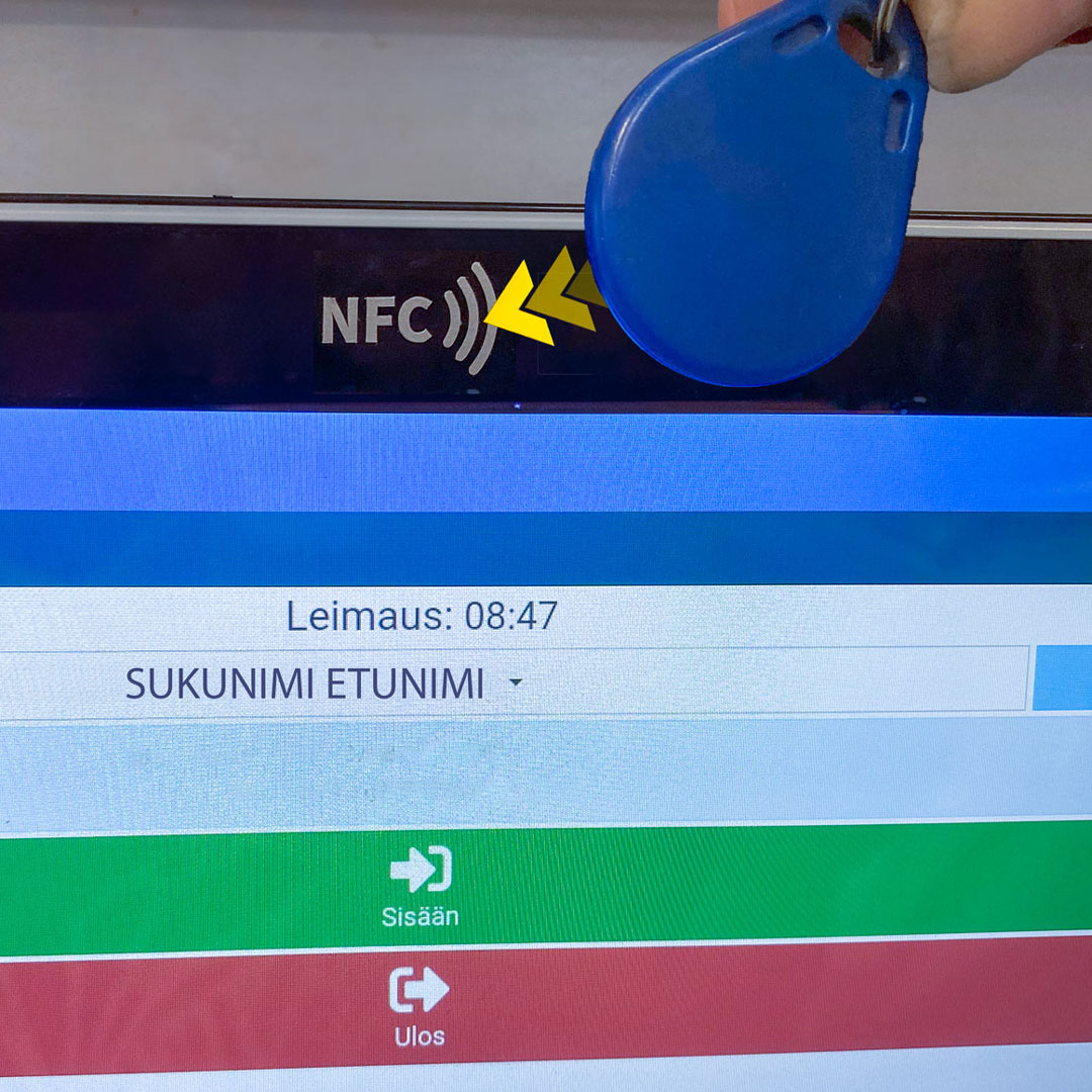 Register your working hours by holding the chip key over the reader at the top of the display. Then choose whether you register in (green) or out (red).
